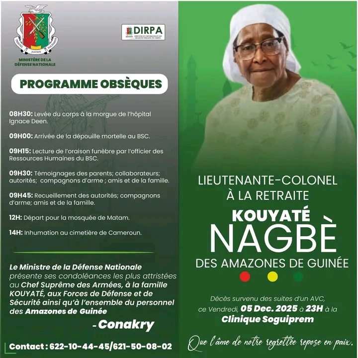 La Guinée pleure l’une de ses icônes. La Lieutenante-Colonelle à la retraite Kouyaté Nagbé, membre fondatrice et figure historique des Amazones de Guinée (premier orchestre exclusivement féminin d’Afrique), est décédée ce vendredi 5 décembre 2025 des suites d’un accident vasculaire cérébral (AVC) à la clinique Soguirem de Conakry. Elle était âgée de 89 ans.