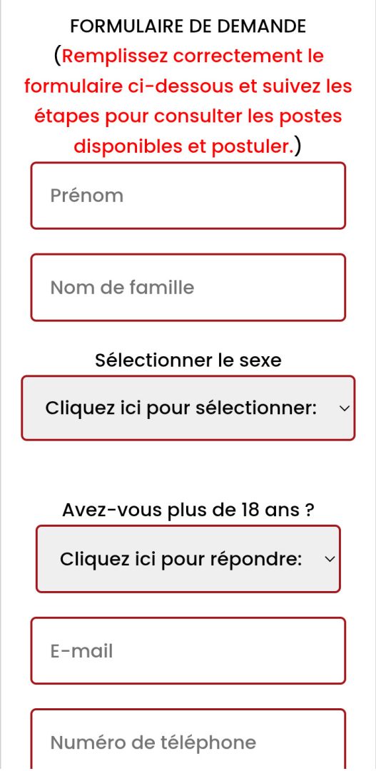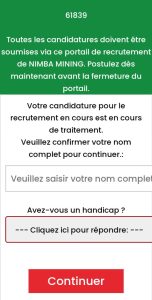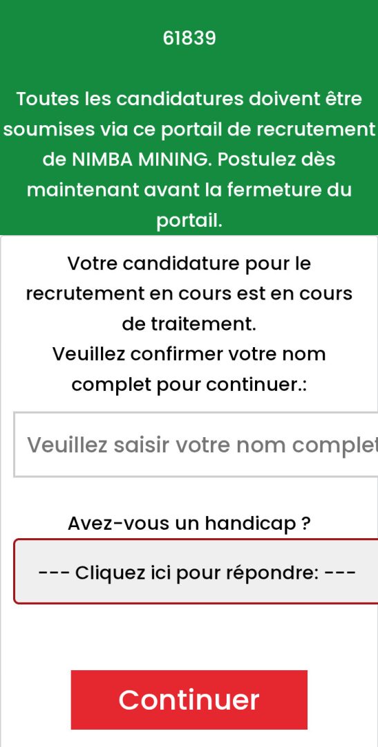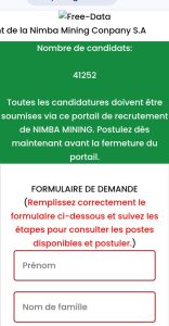 L’alerte, rédigée en français et en majuscules pour capter l’attention, annonce le début du « recrutement de Nimba Mining Company S.A. pour 2026 ». Elle cible particulièrement les jeunes Guinéens en quête d’emploi, en promettant un processus gratuit et accessible via un « portail de recrutement ». Le lien tinyurl redirige vers une page basique qui se présente comme un formulaire d’inscription pour 148 postes, avec des champs pour le sexe, l’âge (supérieur à 18 ans) et le statut de handicap. Une fois le formulaire soumis, les utilisateurs sont invités à « consulter les postes disponibles » et à postuler via un lien externe pointant vers un domaine obscur : otieu.com.