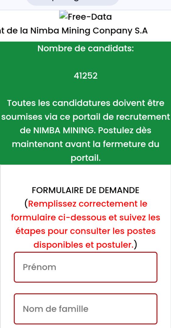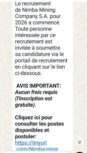 Une annonce circulant massivement sur les réseaux sociaux et les messageries instantanées promet un grand recrutement pour 2026 au sein de la Nimba Mining Company S.A., une entreprise minière guinéenne récemment créée. L’appel invite les candidats à postuler via un portail en ligne accessible par un lien raccourci (https://tinyurl.com/Nimba-mine-recrutement), en soulignant qu’aucun frais n’est requis.