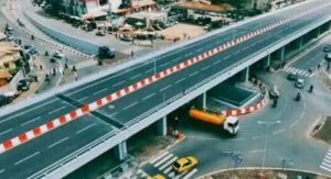 « Vue aérienne d’un échangeur complexe de type turbine en Guinée comme l’Echangeur des Martyrs de Bambéto. »