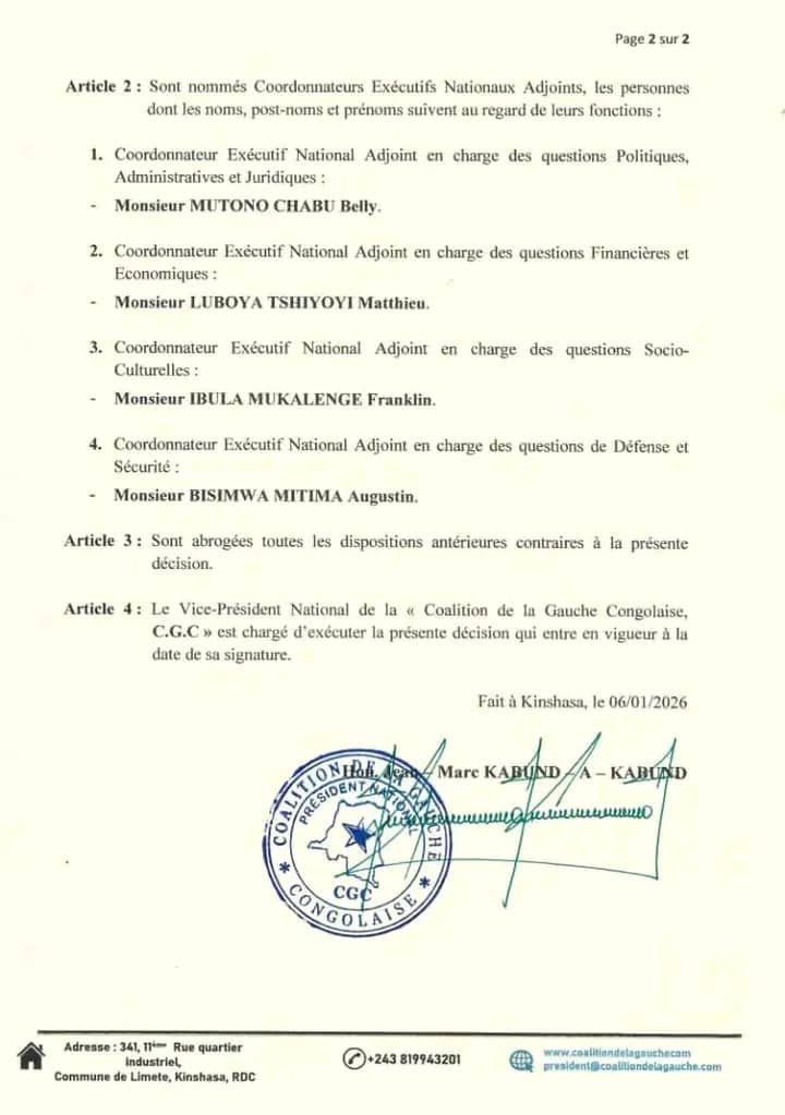 La Coalition de la Gauche Congolaise (C.G.C) a officialisé, le mercredi 07 janvier 2026, la nomination de Belly Mutono Chabu au poste de Coordonnateur National Adjoint chargé des questions administratives et politiques. Ancien Secrétaire général de l’Alliance pour le Changement (A.Ch), il accède ainsi à une fonction stratégique au sein de cette nouvelle plateforme politique.