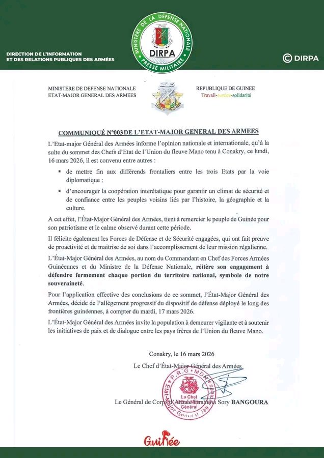 Au lendemain du sommet des chefs d’État de l’Union du fleuve Mano tenu ce lundi à Conakry, l’État-major général des Armées guinéennes a publié un communiqué officiel marquant la fin des différends frontaliers via la voie diplomatique et annonçant des mesures concrètes pour sécuriser les frontières nationales.