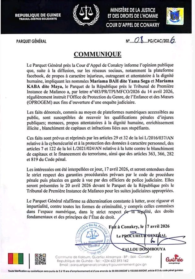 Dans un communiqué rendu public ce vendredi, le Parquet Général indique que les deux femmes ont été interpellées ce jeudi 17 avril 2026. Elles seront présentées le lundi 20 avril 2026 devant le Procureur de la République près le Tribunal de Première Instance de Mafanco.