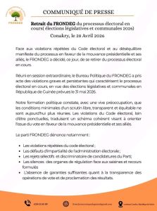 Le Front Démocratique pour la Guinée (FRONDEG) a annoncé, ce mardi, son retrait du processus électoral en cours en vue des élections législatives et communales prévues le 31 mai 2026.