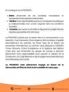 En conséquence, le FRONDEG retire l’ensemble de ses candidats, mandataires et représentants des opérations électorales. Le parti décline par avance toute responsabilité quant aux conséquences politiques et institutionnelles d’un scrutin organisé dans ces conditions et conteste d’ores et déjà la sincérité, la régularité et la légitimité des résultats qui pourraient en découler.