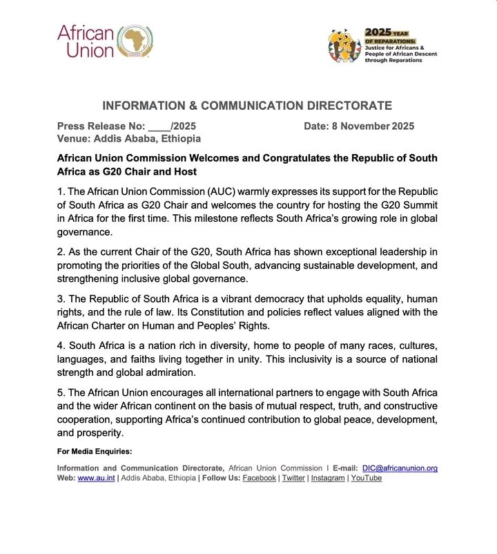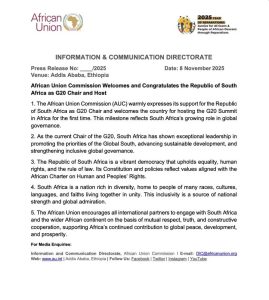 Addis-Abeba, 8 novembre 2025 – Dans un communiqué officiel, la Commission de l’Union africaine (CUA) a adressé un soutien « indéfectible » à l’Afrique du Sud, qui assure pour la première fois la présidence du G20 et accueille le sommet sur son sol. Un événement historique : c’est la première fois qu’un pays africain organise ce rendez-vous des grandes puissances économiques.