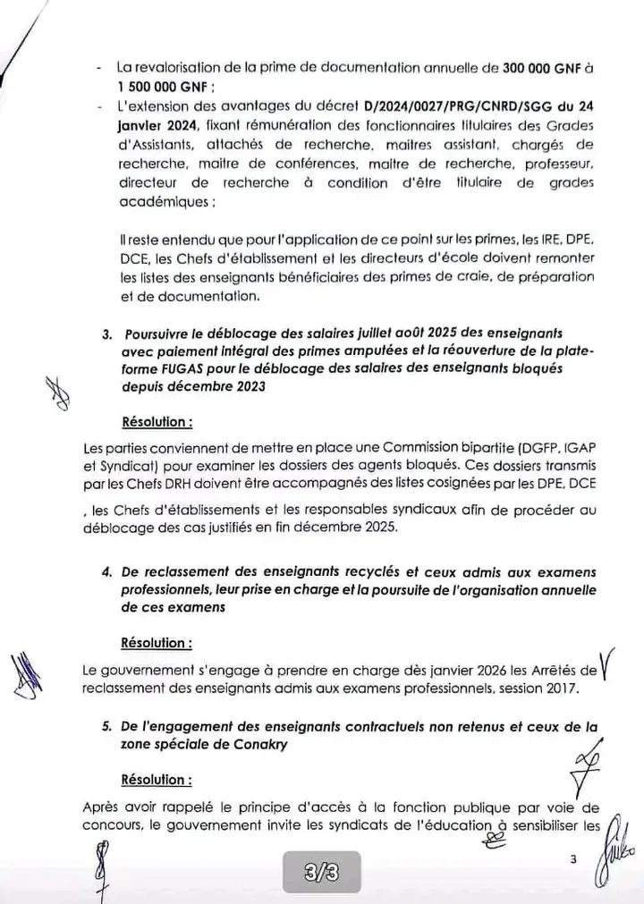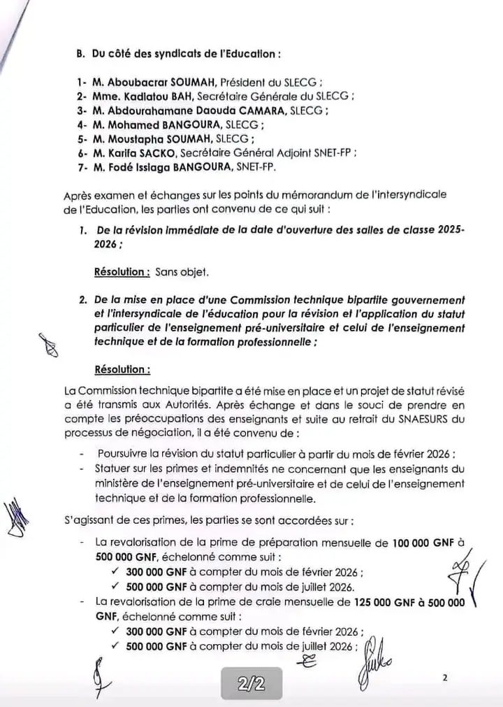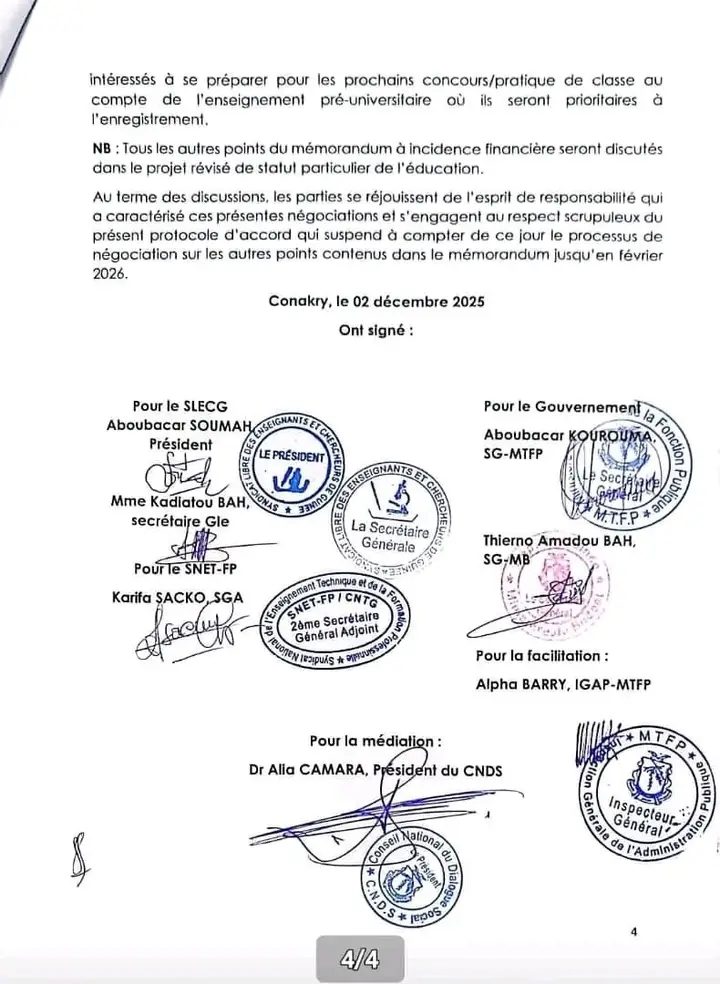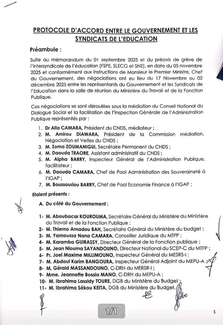 Le protocole a été paraphé ce mardi 2 décembre 2025 à Conakry en présence du président du CNDS Dr Alia Camara (médiateur), du ministre Thierno Amadou Bah (Budget), du SG du MTFP Aboubacar Kourouma, et des leaders syndicaux dont Aboubacar Soumah (SLECG) et Karifa Sacko (SNET-FP).