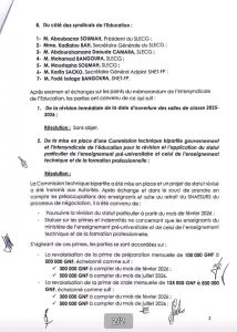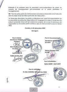 À 72 heures d’une grève illimitée annoncée dans tout le secteur de l’éducation, le gouvernement guinéen et l’intersyndicale de l’éducation (FSPE, SLECG et SNE) ont signé ce mardi 2 décembre un protocole d’accord historique qui désamorce la crise et répond à la quasi-totalité des revendications syndicales.