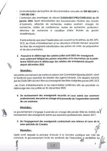 – Extension des avantages du décret D/2024/0027 (janvier 2024) aux enseignants-chercheurs et personnels assimilés des Grades d’Assistants, attachés de recherche, maîtres-assistants, etc., à condition d’être titulaire de grades académiques.