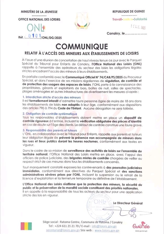 L’Office National des Loisirs (ONL), relevant du Ministère de la Jeunesse, durcit le ton pour protéger les mineurs. À l’issue d’une réunion de haut niveau avec le Parquet Spécial du Tribunal pour Enfants de Conakry, l’ONL a publié un communiqué rappelant les règles strictes d’accès aux établissements de loisirs et annonçant des mesures de contrôle musclées.