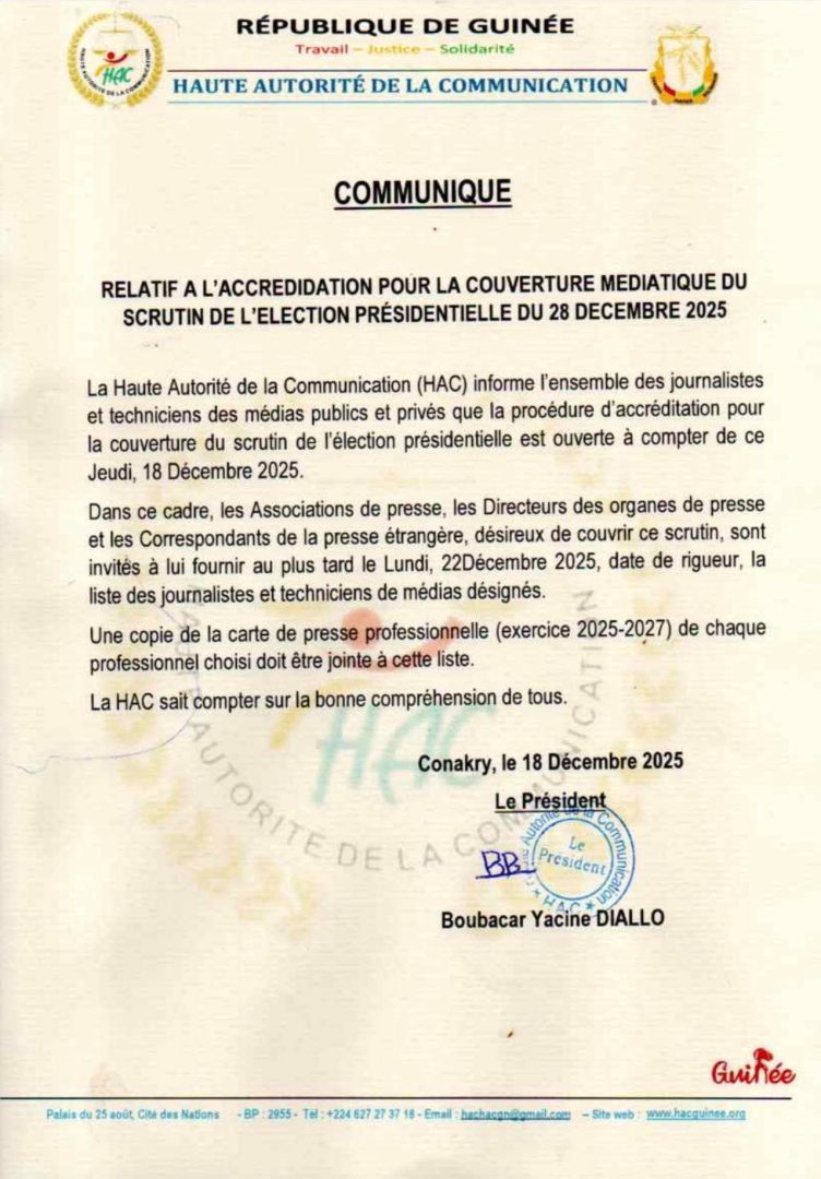 Dans un communiqué officiel rendu public ce jeudi 18 décembre, l’institution présidée par Boubacar Yacine Diallo informe les professionnels des médias publics et privés, ainsi que les correspondants de la presse étrangère, que le processus est ouvert à compter de cette date. Les associations de presse, directeurs d’organes et responsables de rédactions sont invités à soumettre, au plus tard le lundi 22 décembre 2025, la liste nominative des journalistes et techniciens désignés pour couvrir l’événement.