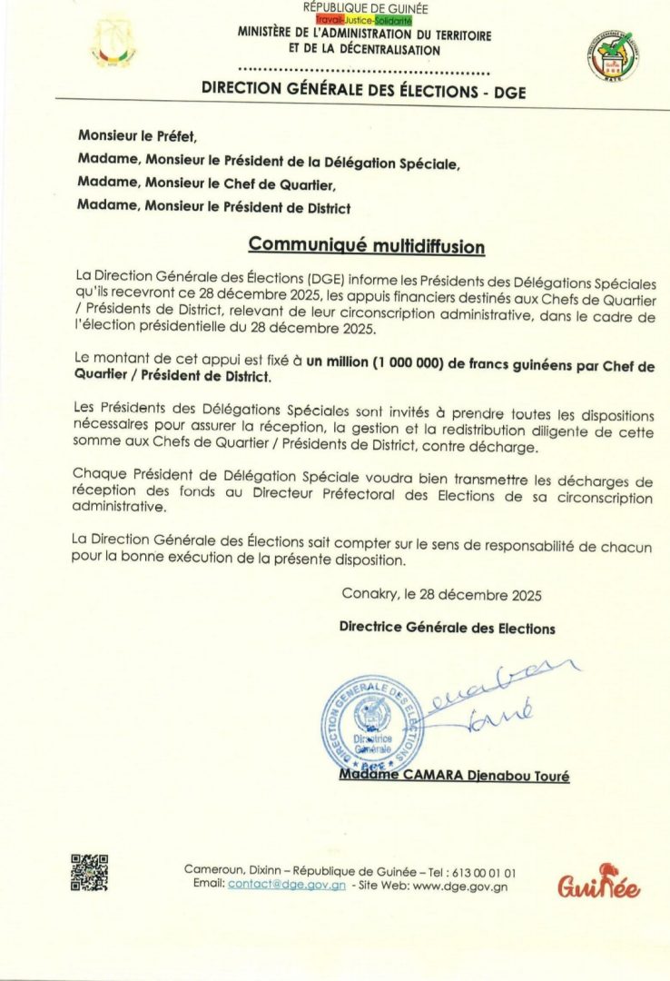 À la veille du premier tour de l’élection présidentielle du 28 décembre 2025, la Direction Générale des Élections (DGE) a annoncé une mesure d’appui financier destinée aux autorités locales impliquées dans l’organisation du vote. Selon un communiqué officiel diffusé ce 28 décembre, chaque chef de quartier ou président de district recevra un million de francs guinéens (1 000 000 GNF) pour couvrir les circonscriptions administratives relevant de leur compétence.