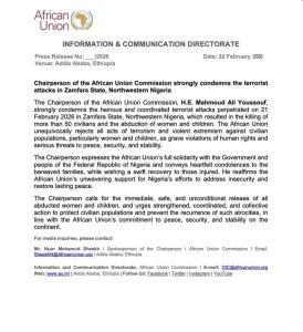 L’Afrique sous le choc. Alors que le Nigeria panse encore ses plaies, l’Union africaine a haussé le ton ce dimanche. La présidence de la Commission UA a fustigé avec une rare vigueur les attaques barbares perpétrées dans l’État de Zamfara, transformant une nouvelle fois le Nord-Ouest du pays en charnier à ciel ouvert.