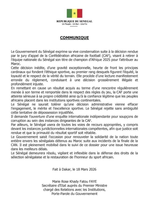 « Le Sénégal demeurera résolu, vigilant et inflexible dans la défense des droits de la sélection sénégalaise et la restauration de l’honneur du sport africain », conclut le texte, signé par Marie Rose Khady Fatou FAYE, Secrétaire d’État auprès du Premier Ministre chargée des Relations avec les Institutions et Porte-parole du Gouvernement.