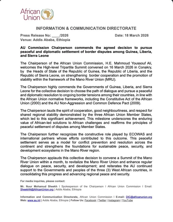 Dans un communiqué publié ce mardi, le président de la Commission s’est félicité de la tenue, le 16 mars 2026 à Conakry, d’un Sommet tripartite de haut niveau initié par les chefs d’État des trois nations membres de l’Union du fleuve Mano (UFM). Ce sommet a permis de renforcer la coopération frontalière et de promouvoir la stabilité régionale.