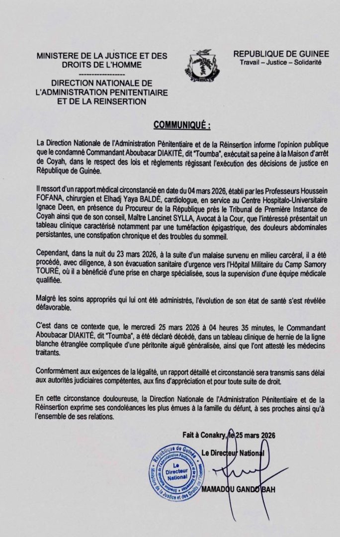 Selon le communiqué officiel, le condamné purgeait sa peine à la Maison d’arrêt de Coyah. Un premier rapport médical établi le 4 mars 2026 par les professeurs Houssein Fofana (chirurgien) et Elhadj Yaya Baldé (cardiologue) du Centre Hospitalo-Universitaire Ignace Deen avait déjà signalé qu’il souffrait d’une tuméfaction épigastrique, de douleurs abdominales persistantes, de constipation chronique et de troubles du sommeil.
