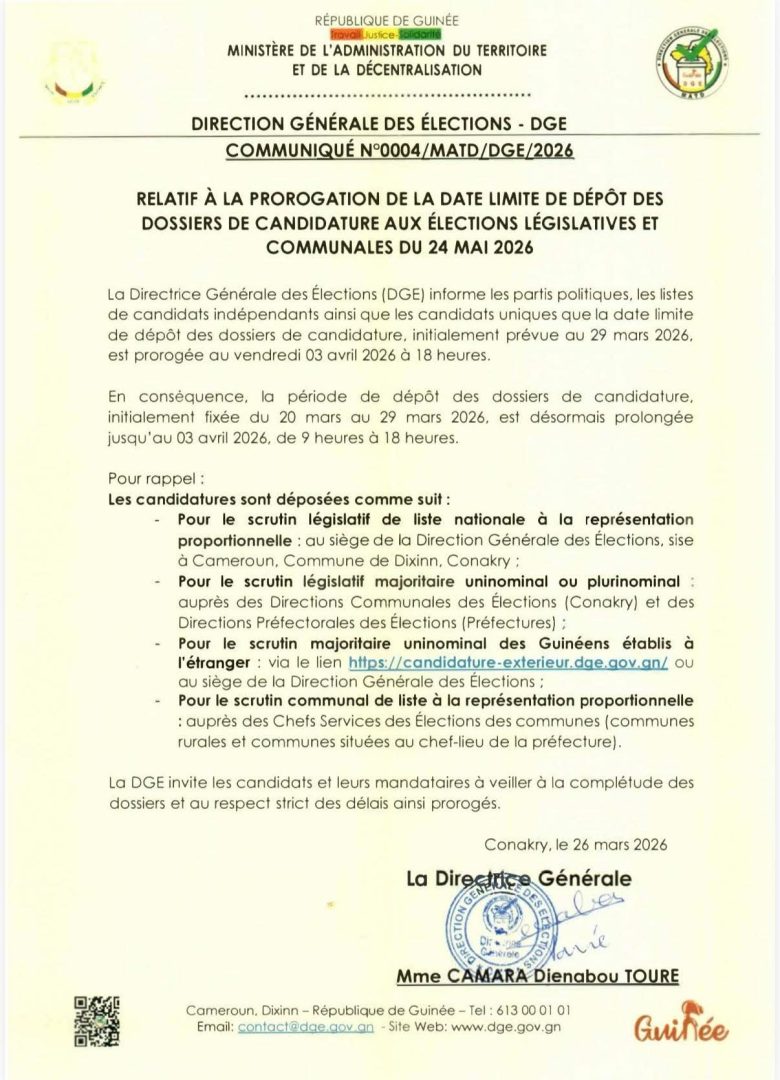La Direction Générale des Élections (DGE) a annoncé une prorogation de la date limite de dépôt des dossiers de candidature pour les élections législatives et communales prévues le 24 mai 2026. Initialement fixée au 29 mars, cette échéance est désormais repoussée au vendredi 3 avril 2026 à 18 heures.