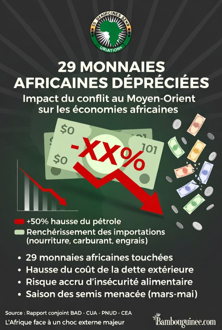 L’escalade du conflit au Moyen-Orient provoque déjà des ondes de choc sur le continent africain. Selon un rapport conjoint de la Banque africaine de développement (BAD), de la Commission de l’Union africaine (CUA), du Programme des Nations Unies pour le développement (PNUD) et de la Commission économique des Nations Unies pour l’Afrique (CEA), présenté en marge de la 58e session de la Commission économique pour l’Afrique à Tanger (Maroc), 29 monnaies africaines se sont dépréciées face au dollar américain.
